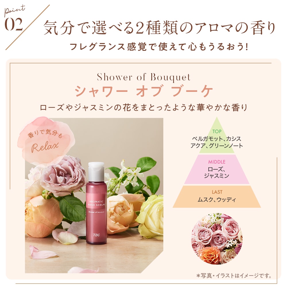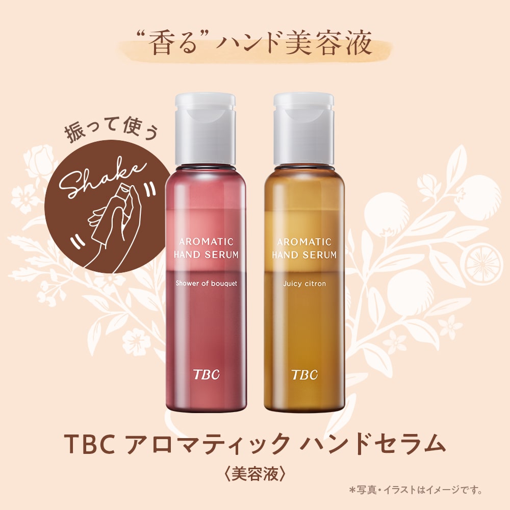 「TBC アロマティック ハンドセラム」は、美肌のために重要なスキンケアステップである、「与える(浸透※)ケア」を「エッセンス層」で、「保護するケア」を「ミルク層」で行い、美しい手肌に整える、ハンド用美容液です。