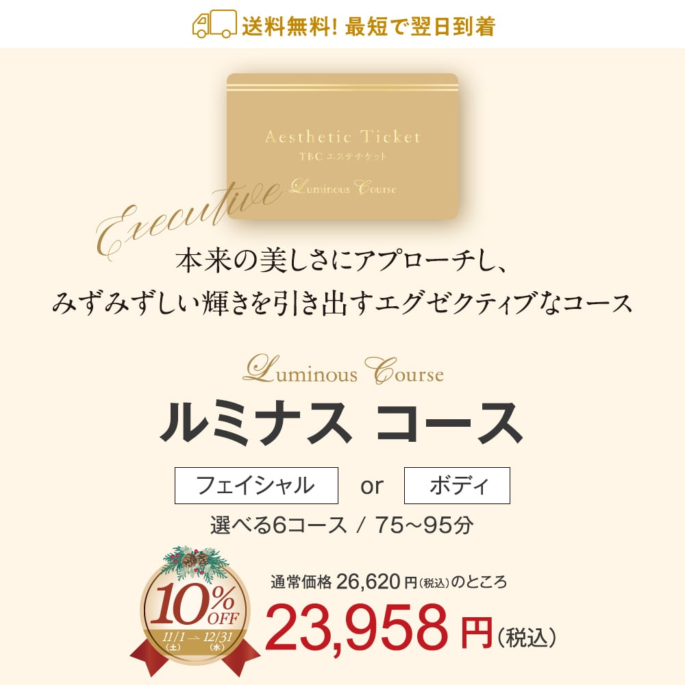 ルミナスコースは、充実のエステティックトリートメントで本来の美しさにアプローチし、みずみずしい輝きを引き出すエグゼクティブなコース。フェイシャル・ボディより、ご希望のコースをいずれか1コース(1回)ご利用いただけます。
